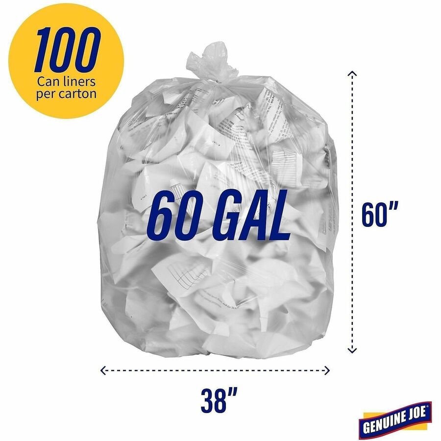 Medium-duty trash bags are made with high-grade, high-density resin for superior strength and performance so you can enjoy greater puncture-resistance. They are ideal for office or light industrial waste. Translucent plastic allows easy viewing of contents so the trash bags can also help with pilferage control. Star-bottom construction easily conforms to any size trash can and spreads trash around the bottom of the bag. The star seal, or X-seal, is designed for more even distribution of contents. Bags come in a convenient coreless roll for compact storage and easy dispensing anywhere. Rolls are perforated for easy access. The 17 micron thick bag holds 55 to 60 gallons of garbage. Bag size is 38" x 60".